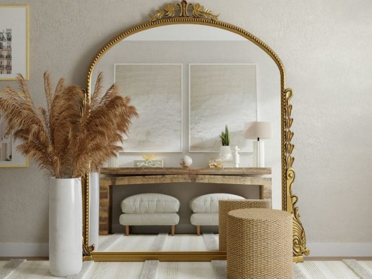 Ο εντυπωσιακός καθρέφτης με χρυσή κορνίζα γίνεται το απόλυτο statement στον χώρο. Συνδυασμένος με μια φυσική σύνθεση pampas grass σε λευκό βάζο, προσδίδει κλασική φινέτσα και φυσική αίσθηση. Η τοποθέτηση του καθρέφτη πίσω από μια ξύλινη κονσόλα δημιουργεί βάθος και φέρνει αρμονία στη σύνθεση. Είναι ιδανική επιλογή για όσους αγαπούν τη διακριτική πολυτέλεια.